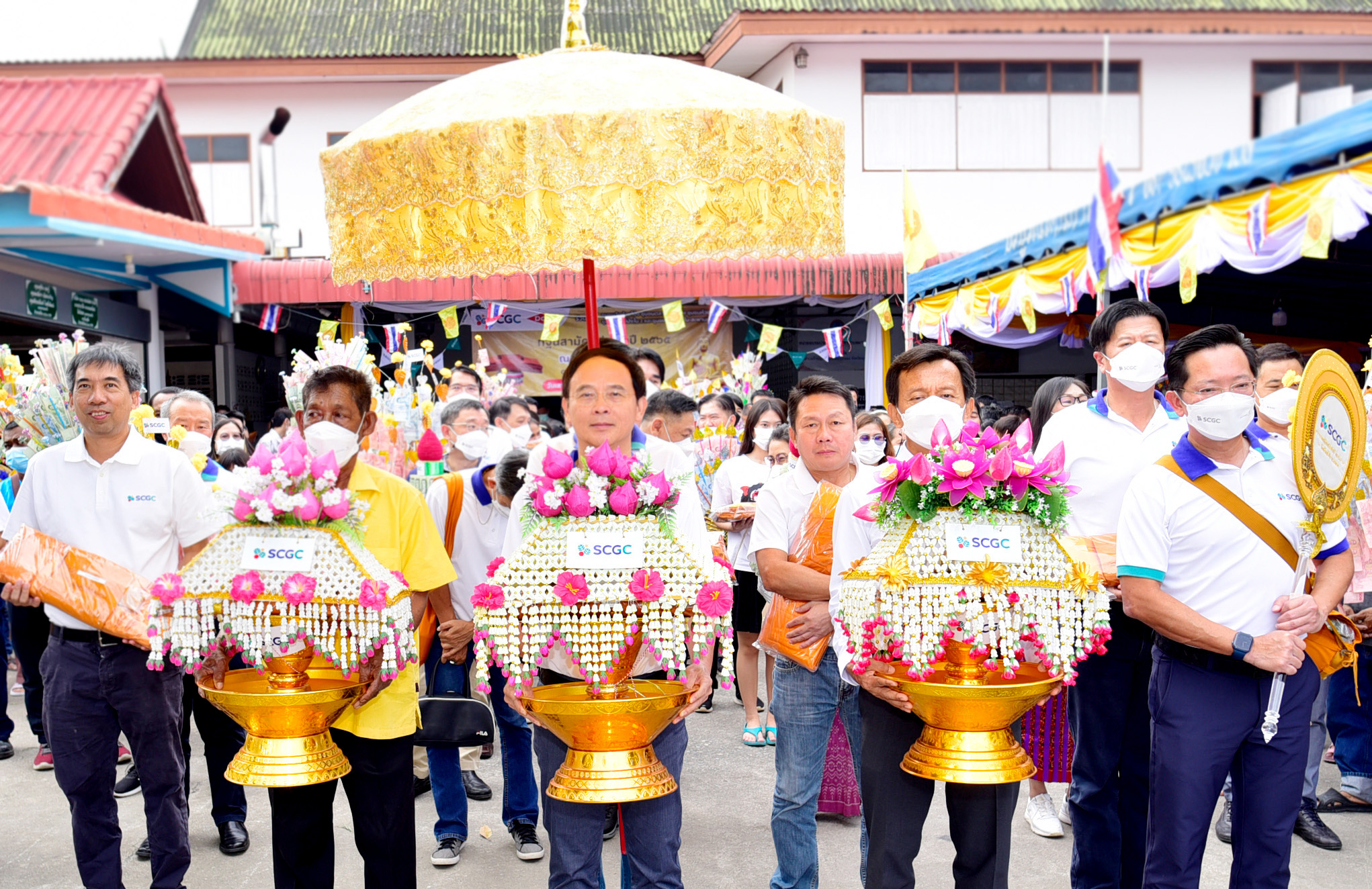 Senior executives of SCGC led by Mr. Tanawong Areeratchakul, together with Dow Thailand Group led by Mr. Sutin Prapaitrakool, Integrated Supply Chain Director, Wat Huai Pong, Talad Huai Pong, Huai Pong Nai 1, Huai Pong Nai 2 and Huai Pong Nai-Saphan Nam Tuam communities leaders, joined the ceremony and walked in the Kathin procession. The ceremony was held at Huai Pong Temple, Rayong province. SCGC, Dow Thailand Group, executives, staff, and donors have raised 1,464,891.50 Baht donations.