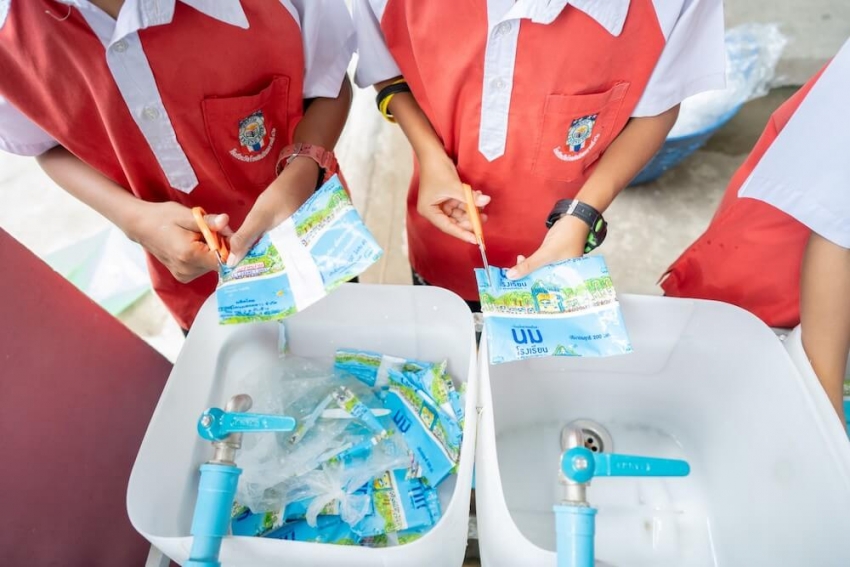 The Thai government’s School Milk Program was established during the fiscal year of 1992 as a measure against malnutrition in children by imposing the policy that schoolchildren drink one bag of pasteurized milk daily for a minimum of 200 days per year. This led to the accumulation of over 1,288,891,600 milk pouches, or 3,532 tons of waste, nationally. Wat Khod Hin Mittraphap 42 School also encountered this problem. In the past, these milk pouches, made from LLDPE plastic, turned into waste destined for landfills. Oftentimes, discarded milk pouches remained for extended periods of time at in-school waste sites before being processed by the city, leading to two major problems: unpleasant odor from spoiled milk and the spread of bacteria that could potentially be harmful for children and staff at the school.