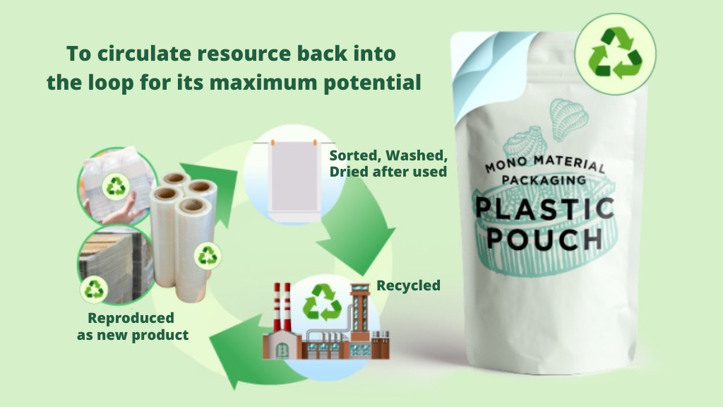 • MONOme: Recyclable pouch with good moisture barrier, suitable for general products e.g. candy, sugar, rice, grains, or even electric gadget, etc.