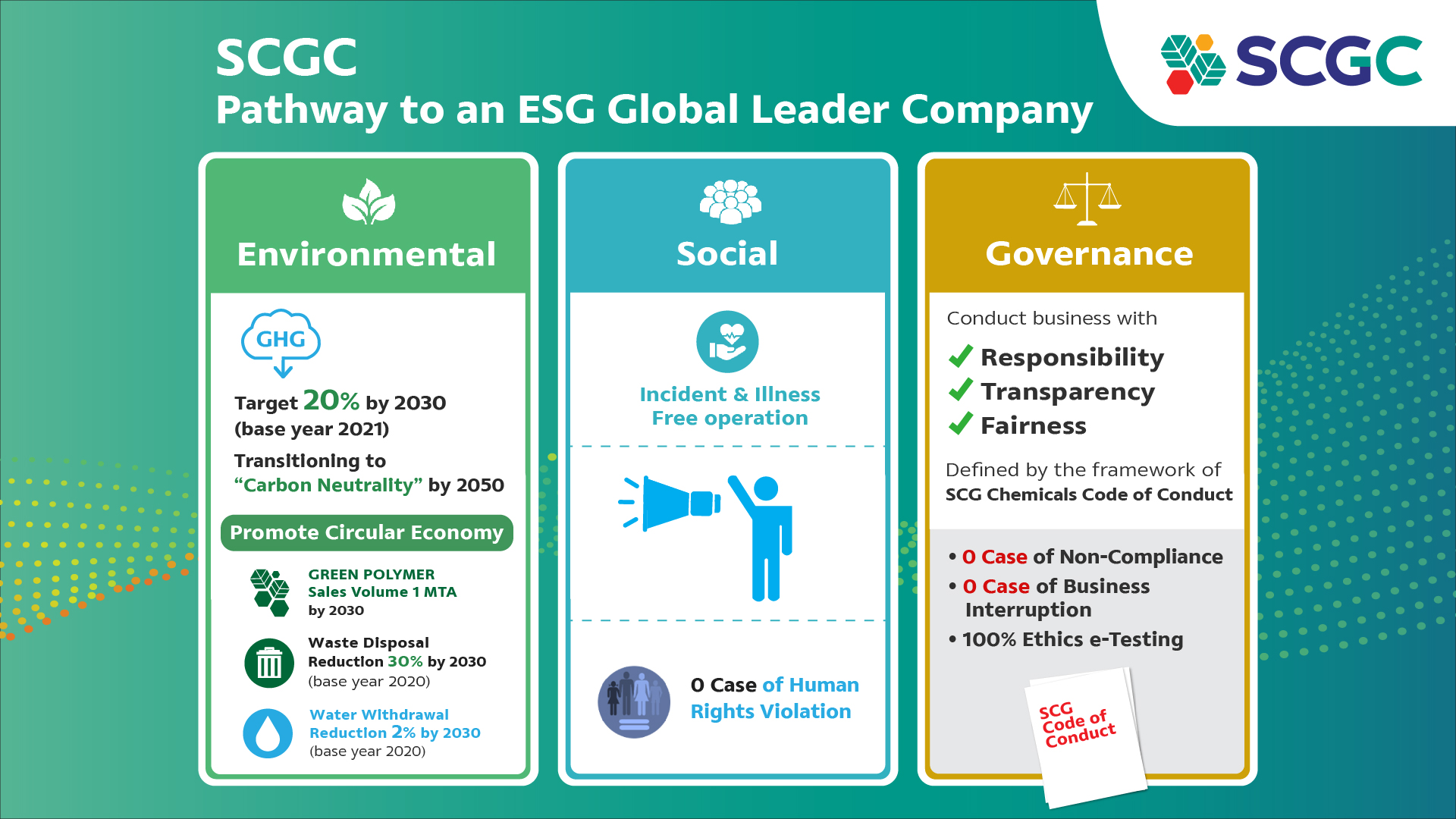 SCGC has established guidelines and goals for three dimensions of ESG to drive sustainable operations: