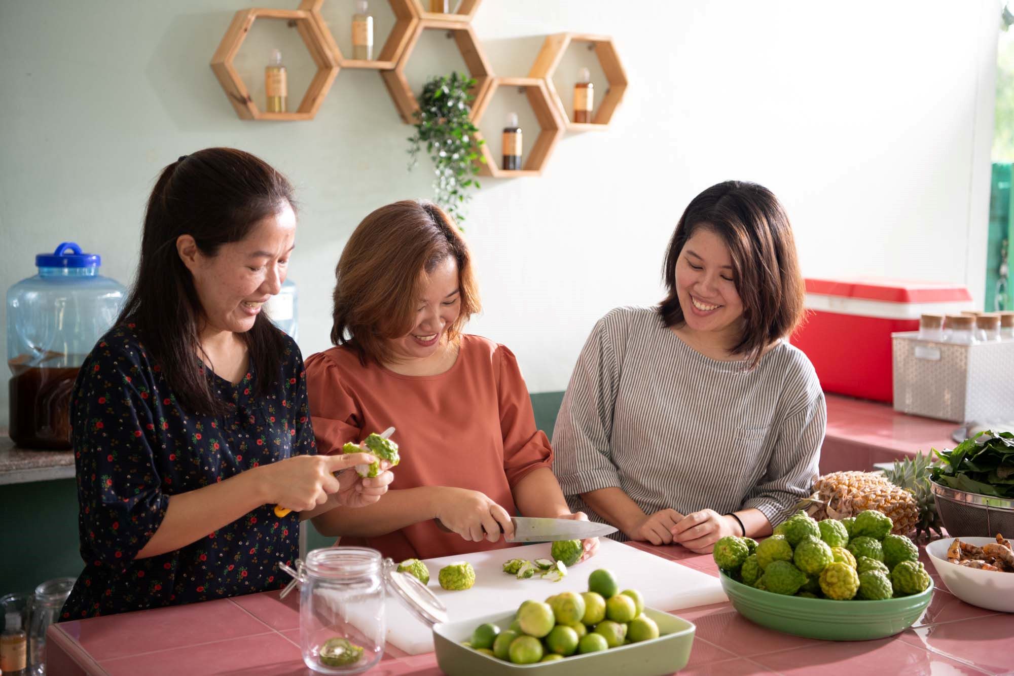 Take 'kaffir lime' as an example, one of the key ingredients in Baan Ralin's products. Por sources kaffir lime grown organically by local villagers as an ingredient in her products. The kaffir limes, large and with glossy skins, are delivered from the community to Baan Ralin. These fruits are grown in self-mixed soil, nourished with organic fertilizer until they reach full growth. Another indispensable agricultural product, the pineapple, cannot be overlooked. “Rayong Golden Pineapple,” a fruit with a Geographic Indication (GI) from the province, is also an ingredient in Baan Ralin's products, increasing villagers' income from growing crops free of toxic substances. This improvement in their livelihood comes alongside consumers having access to safe products.