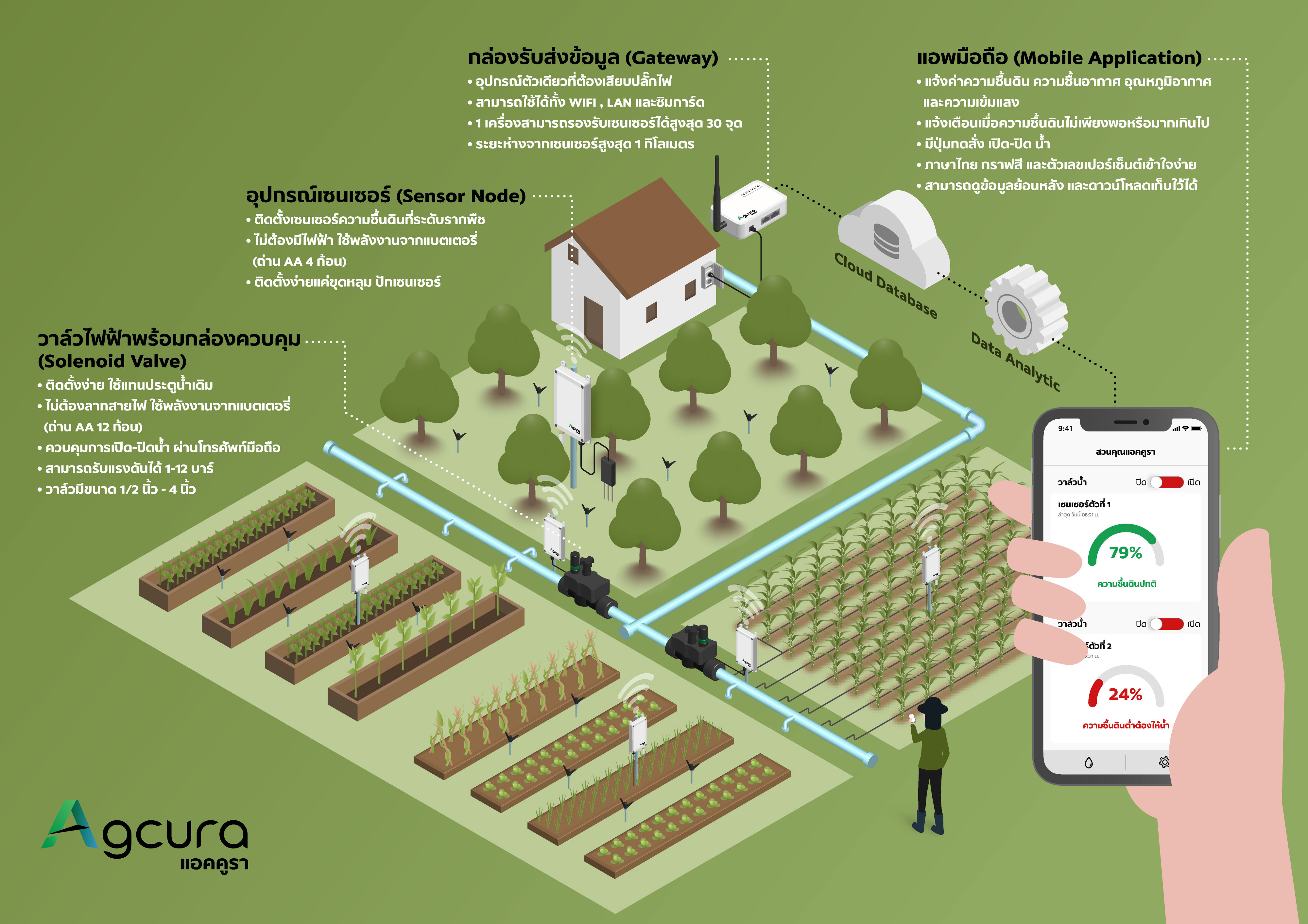 Agcura (แอคคูร่า) เป็นนวัตกรรมที่คิดค้นขึ้นเพื่อให้เกษตรกรไทยสามารถทำการเกษตรได้แม่นยำด้วยวิธีที่เป็นมิตรต่อสิ่งแวดล้อม โดยนำเอาเทคโนโลยีด้านเซนเซอร์เข้ามาผสมผสานกับความรู้ทางด้านการเกษตร ทีมงาน Agcura เริ่มต้นจากการลงพื้นที่สอบถามและทำความเข้าใจถึงปัญหาที่เกิดกับเกษตรกรทั่วประเทศไทยเพื่อตั้งเป็นโจทย์สำหรับการพัฒนานวัตกรรมในครั้งนี้ โดย 3 ปัญหาหลักที่พบ ได้แก่ สภาพอากาศที่แปรปรวนไม่อาจคาดเดาได้ ปัญหาภัยแล้ง และปัญหาการจัดการทรัพยากร ทั้งหมดล้วนเกี่ยวข้องกับ ‘น้ำ’ ซึ่งเป็นปัจจัยสำคัญต่อคุณภาพของผลผลิตและส่งผลต่อต้นทุน
