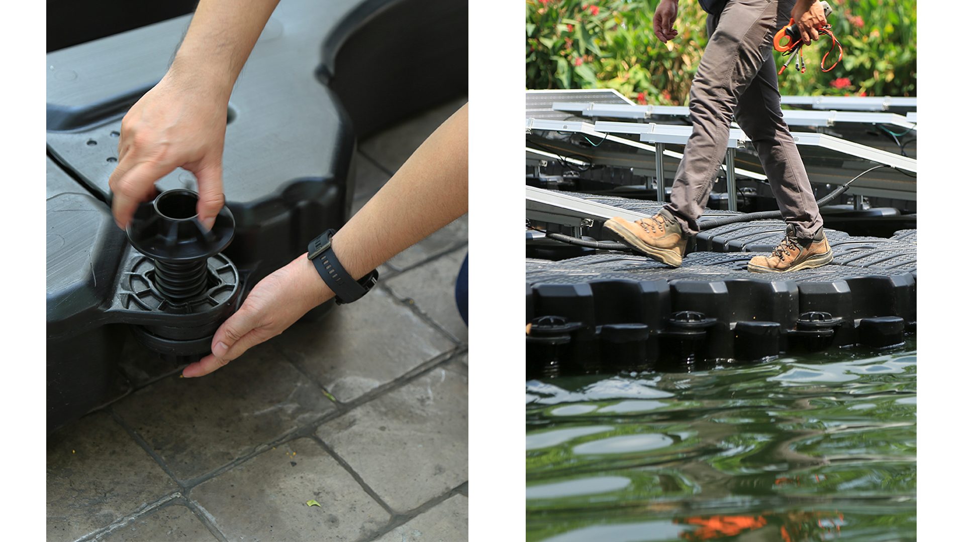 สำหรับตัวทุ่นลอยน้ำจะแบ่งออกเป็นสองส่วนหลัก ส่วนแรก คือ Solar Stand สำหรับยึดกับแผงโซลาร์เซลล์ ได้รับการออกแบบให้สามารถติดตั้งแผงโซลาร์เซลล์ได้หลากหลายประเภท สามารถรองรับน้ำหนักของแผงโซลาร์เซลล์รุ่นใหม่ที่มีการพัฒนาขนาดแผ่นใหญ่ขึ้นได้ และสามารถปรับมุมองศาได้ตามพื้นที่เพื่อประสิทธิภาพการรับแสงแดดสูงสุด ส่วนที่สอง คือ ทุ่นทางเดิน ซึ่งคำนึงถึงความปลอดภัยสำหรับวิศวกรหรือผู้ใช้งานที่ต้องเดินปฎิบัติงาน ตรวจสอบ หรือทำความสะอาดแผงโซลาร์เซลล์ จึงออกแบบทุ่นทางเดินให้มีแรงลอยตัวเหนือผิวน้ำมากกว่าทุ่นในท้องตลาดทั่วไป ทำให้สามารถรับน้ำหนักได้มากถึง 200 กิโลกรัมต่อตารางเมตร ผู้ปฎิบัติงานสามารถยืนและเดินได้อย่างมั่นคง ที่สำคัญคือ ช่วยป้องกันปัญหาทุ่นจมน้ำและไม่มั่นคงในเวลาเดินหรือปฏิบัติงาน ซึ่งวิศวกรหรือผู้ใช้งานอาจเกิดอันตรายได้